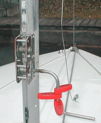 Have a bumper or cushion on the stern so the mast won't scratch the fiberglass. If someone holds the top of the mast it really helps while you pull the mast to the stern and put the mast hinge pin in the slot on the rear of the mast. With the jib halyard shorter than the mast, tie it to a line run through the bow eye and back to the cockpit. Hopefully you have a spinnaker cleat near the mast you can use, if it has a padeye mounted on it be sure that the line is through the padeye. You can also use a jib cleat. |